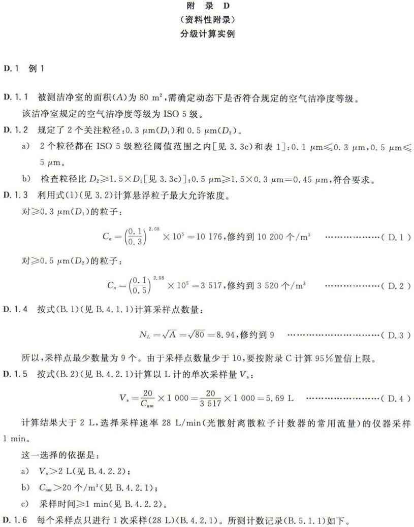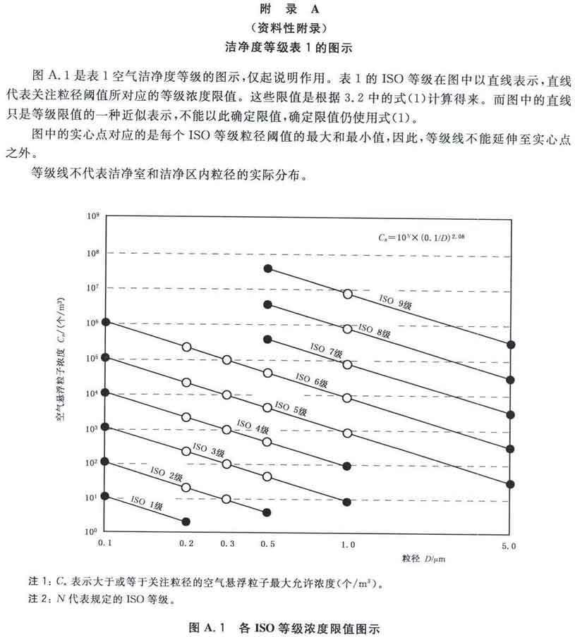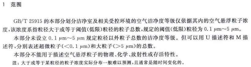 GB/T25915的本部分劃分潔凈室及相關(guān)受控環(huán)境的空氣潔凈度等級(jí)僅依據(jù)其內(nèi)的空氣懸浮粒子濃度,該濃度系指粒徑大于或扥估閾值(低限)粒徑為0.1μm~5μm規(guī)定粒徑以外粒子總數(shù)的潔凈度等級(jí)。但可以用U描述符合M描述符,分別表述超微粒子(<0.1μm)和大粒子(>5μm)的總數(shù)。